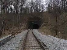 The Henryton Tunnel, located near Henryton in southern Carroll County, Maryland, is the third-oldest tunnel in the world that remains in active railroad use.[2] Constructed by the Baltimore and Ohio (B&O) Railroad and opened around 1850, it was the first tunnel constructed on the B&O's Old Main Line. In 1865 the tunnel was widened to accommodate double track. It was rebuilt into its current form in 1903. The tunnel has brick portals and lining. The coping and footings are concrete.[1]: 452