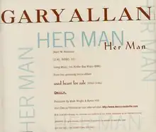 "Her Man" is a song written by Kent Robbins. Originally recorded by American country music artist Waylon Jennings on his 1990 album The Eagle, it was later covered in 1996 by Gary Allan on his debut album Used Heart for Sale. Allan's version was released in August 1996 as his debut single and as the album's first. His rendition peaked at number 7 on the US country singles charts and number 9 in Canada.