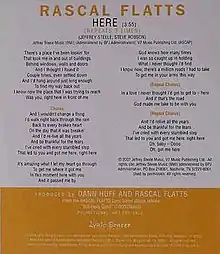 "Here" is a song written by Jeffrey Steele and Steve Robson and recorded by American country music group Rascal Flatts. It was released in September 2008 as the fifth and final single from their fifth studio album Still Feels Good.