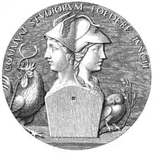 During the Renaissance, a number of artists, for example Rubens and Vincenzo Cartari, portrayed Hermathena in art either as two gods acting in conjunction, or as a single deity with the attributes of the other, for example Athene holding the caduceus, which was a symbol of Hermes.[7] On the ceiling at the Villa Farnese is a late-16th-century fresco of Hermathena, called the Gabinetto dell'Ermatena,[8] by Federico Zuccari; the fresco depicts an androgynous fusion of the deities.[9]