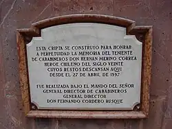 The remains of Lieutenant Hernán Merino Correa were laid to rest in a chapel erected at the Carabineros de Chile School. From there they were transferred to the Metropolitan Cathedral of Santiago, being buried in the Santiago General Cemetery, after being bid farewell by thousands of Chileans and high authorities of the Carabineros and the government, including the president Eduardo Frei Montalva. Years later, on April 26, 1997, Merino's remains were moved with honors to the crypt built in his memory at the foot of the martyrs' monument.