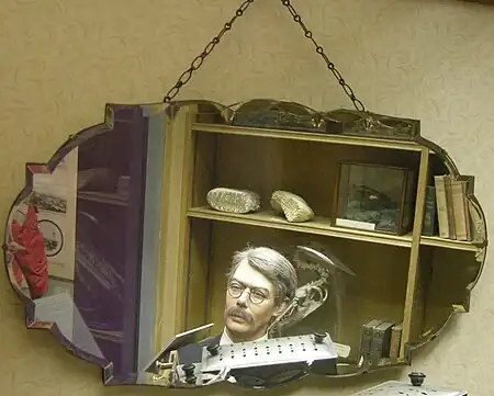 There was an exhibition about the colour blue in February and March 2008.[18] An exhibition about the cartoonist Giles took place in summer 2009.[19] The Herne Bay Living History community memories group contributes to some of these exhibitions, and The October–December 2009 exhibition was entitled "Make do and Mend", using local evidence such as photographs and memories, to show how everyday objects were re-used during wartime.[14] Craft activities and quizzes for families take place in association with the exhibitions.[20] The permanent Tom Bowes exhibition shows him as a wax model with his collection and books.[14]