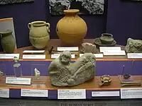 Roman exhibits found at the fort or in the sea nearby include a limestone building block, Belgic ware, redware, an iron clench pin, a barbed arrowhead, a funerary urn or poppy beaker, pipe clay figurines, a marble carving, a ragstone lamp, styluses, bone pins, a shale spindle whorl and wall plaster.[6]