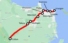 Hervey Bay railway line, sometimes known as Urangan railway line, is a closed railway line in Queensland, Australia. It was opened in 1896 to Pialba and it was extended to Urangan in 1913. It was extended to the end of the Urangan Pier in 1917, along with the opening of the pier.[1] It was closed in 1993.