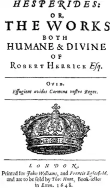 Hesperides (/hɛˈspɛrɪdiːz/) (complete title, Hesperides; or the Works both Human and Divine of Robert Herrick Esq.) is a book of poetry published in 1648 by English Cavalier poet Robert Herrick. This collection of 1200 lyrical poems, his magnum opus, was published under his direction, and established his reputation.[1][2] It is replete with carpe diem sentiments. The title refers to the Hesperides, nymphs of the evening in Greek mythology.