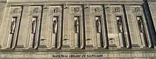 Between 1950 and 1955 he also sculpted the artwork adorning the facade of the National Library of Scotland in Edinburgh, for which he produced a series of tall, allegorical figures, depicting history, law, medicine, music, poetry, science and theology.[2] The architect of the library was Reginald Fairlie, who had been apprentice to Lorimer's father Robert. Lorimer carved the figures directly into the stone rather than copying from clay models, a practice known as direct carving.[3] Also for Fairlie, Lorimer created a massive tympanum frieze showing St Francis returning to Assisi for The Friary in Dundee in 1959.[4]