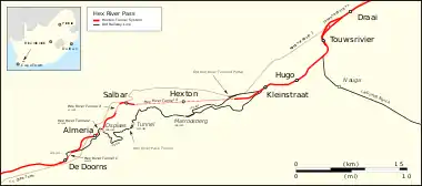 The four Hex River Tunnels consist of a twin tunnel of 0.5 kilometres (0.31 miles) and three single tunnels of 1.1 kilometres (0.68 miles), 1.2 kilometres (0.75 miles) and 13.5 kilometres (8.39 miles), on the Hexton railway route between De Doorns and Kleinstraat through the Hex River Mountains of the Western Cape Province, South Africa. The line, which connects De Doorns in the Hex River valley with Touws River in the Great Karoo, is part of the main rail route between Cape Town and Johannesburg. Of the 30 kilometres (18.64 miles) of track, 16.8 kilometres (10.44 miles) are underground. Construction of the line eliminated the bottleneck of the Hex River rail pass.[1][2][3]