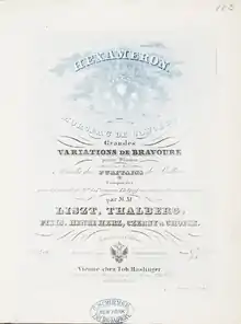 Princess Belgiojoso commissioned Hexaméron—the title refers to the Biblical six days of creation—for a benefit concert for the poor on 31 March 1837 at the princess's salon in Paris.[1] The musicians did not complete the piece on time, but the concert was held as scheduled. The concert's highlight was a piano "duel" between Thalberg and Liszt for the title of "greatest pianist in the world." Princess Belgiojoso announced her diplomatic judgment: "Thalberg is the first pianist in the world–Liszt is unique."[2]