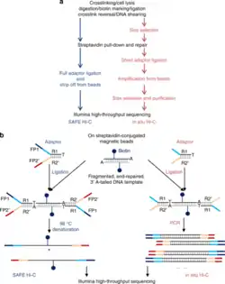 SAFE Hi-C, or simplified, fast, and economically efficient Hi-C, generates sufficient ligated fragments without amplification for high-throughput sequencing.[16] In situ Hi-C data that has been published indicates that amplification (at the PCR step for library preparation) introduces distance-dependent amplification bias, which results in a higher noise to signal ratio against genomic distance.[16] SAFE Hi-C was successfully used to generate an amplification-free, in situ Hi-C ligation library from as low as 250 thousand K562 cells.[16] Ligation fragments are anywhere between 200 and 500 bp long, with an average at about 370 bp.[16] All ligation product libraries were sequenced using the Illumina HiSeq platform (2x150 bp paired-end reads).[16] Although SAFE Hi-C can be used for a cell input as low as 250 thousand, Niu et al. recommend using 1 to 2 million cells.[16] Samples produce enough ligates to be sequenced on one-fourth of a lane.[16] SAFE Hi-C has been demonstrated to increase library complexity due to the removal of PCR duplicates which lower the overall percentage of unique paired reads.[16] Overall, SAFE Hi-C preserves the integrity of chromosomal interactions while also reducing the need to have high sequencing depth and saving overall cost and labor.[16]
