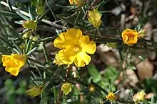 The erect and multi-branched shrub typically grows to a height of 0.25 to 1.0 m (9.8 in to 3 ft 3.4 in).[2] The small green leaves are around 20 mm (0.79 in) in length with a width of 1 mm (0.039 in).[3] It blooms between July and October and produces yellow flowers.[2] The flowers have a diameter of around 15 mm (0.59 in).[3]