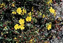 Hibbertia rufa, commonly known as brown guinea flower,[2] is a species of flowering plant in the family Dilleniaceae and is endemic to south-eastern Australia. It is a weak, prostrate to scrambling shrub with wiry branches, linear leaves and yellow flowers with three or four stamens arranged in a cluster on one side of the two carpels.