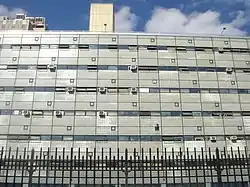 The building that now houses the school was built in 1959 by the architectural firm of Kelly & Gruzen (now known as Gruzen Samton Architects) and is one of the best known structures designed utilizing a vigorous display of the international architectural style movement in the city.[1] It was also the first high school in the city to have escalators.[2] The school is home to a mural, located at its main entrance, that was designed by Hans Hofmann, one of the leading artists of the Abstract Expressionist movement.[3] The building is located on West 49th Street between 9th and 10th Avenues.