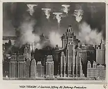High Treason is a 1929 film[1] based on a play by Noel Pemberton Billing. It was directed by Maurice Elvey, and stars James Carew, Humberstone Wright, Benita Hume, Henry Vibart, Hayford Hobbs, Irene Rooke, and Jameson Thomas.[2] Raymond Massey makes his first screen appearance in a small role. The film was initially produced as a silent but mid-way during production, Elvey was pushed by the studio to add sound to the film in order to cash in on the talkies. Although a third of the film was filmed in sound, Elvey maintained much of the silent footage and dubbed over the dialogue for shots that were originally silent, with Elvey himself voicing some of the minor characters, which he admitted when interviewed by the Manitoba Free Press shortly after the film was released in the US.[3] Likewise, BIP's Blackmail, directed by Alfred Hitchcock was also turned into a sound picture mid-way during production (concurrently when High Treason was also in production) and many of the silent scenes used dubbed dialogue and sound effects in a similar fashion to High Treason.