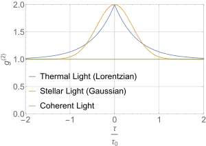 This model fits the observation that was done by Hanbury Brown and Twiss using stellar light as demonstrated in figure 3. If thermal light was used instead of stellar light in the same setup, then we would see a different function for the second order coherence.[10] Thermal light can be modeled to be a Lorentzian power spectrum centered around frequency , which means , where is the coherence length of the beam. Correspondingly, and . The second-order coherence for stellar (Gaussian), thermal (Lorentzian) and coherent light is shown in Figure 4. Note that when stellar/thermal light beam is first order coherent i.e. , the second order coherence is 2, meaning at zero time delay chaotic light right is first order coherent but not second order coherent.[2][10]