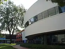 Following on from these high impact developments, the campus saw several smaller developments: Clarkson House, a small halls of residence suitable for disabled students and now the Early Years Centre, opened in 1978 just south of the Administration building and partly funded by the British Council for the Disabled, the Clarkson Foundation and the Department of Health and Social Security.[45] New facilities for Engineering were being constructed behind housing (now demolished) in University Crescent and were all of the industrial nature: the R J Mitchell Wind Tunnel was relocated from Farnborough and reconstructed in 1981, the A B Woods underwater laboratory in 1989[46] and the Tony Davies High Voltage Laboratory in 1991.[47] The final building from this period was a small addition located on Burgess Road next to the Oceanography building. Now housing some of ECS, it opened in 1989 and was designed by Sheppard Robson.[48]