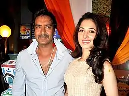 Himmatwala (transl. The brave one) is a 2013 Indian Hindi-language action comedy film written and directed by Sajid Khan and jointly produced by UTV Motion Pictures and Vashu Bhagnani. The film features Ajay Devgn and Tamannaah Bhatia in the lead roles. Set in 1983, it is an official remake of the 1983 film of the same name by K. Raghavendra Rao, which was, in turn, a remake of the 1981 Telugu film Ooruki Monagadu. The film was released on 29 March 2013.[3][4] The film marks Tamannaah's comeback to Bollywood after she debuted in the 2005 film Chand Sa Roshan Chehra.