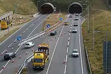 The Hindhead tunnel with the northbound carriageway closed for maintenance