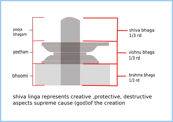 Shivalingas are installed in temples and are fixed to ground or a base. They are usually made of stones or metals. The sacred texts suggest that the shiva linga must have three parts. A bottom most 1/3rd part that is in the earth - Brahma bhagam (represents Brahma, the Creator of the World) it is rectangular in cross section.[8] A middle 1/3rd part is called Vishnu bhagam or Vishnu Bhaga (it represents Vishnu, the Protector and sustainer of the world; it is octagonal in cross section. Both the Brahma bhagam and Vishnu bhagam are embedded in peetham (the ornamental pedestal).[9] A visible 1/3rd Shiva Pooja bhagam or Pooja bhaga (also known as Rudra bhagam or Rudra bhaga) which is top most part which is worshiped. It is circular in cross section and cylindrical in shape. It represents Rudra (Shiva), the destroyer of the world. It is known as Pooja bhagam because this part is worshipped.[9] Brahmasutras: These are certain essential lines present on the Rudra bhagam (Rudra bhaga). Without them a Shivlinga is unfit to be worshipped.[9] The Shiva linga is at the level of ground and easily accessible to the worshipers irrespective of their caste, social or economic status.