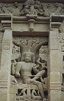 Somaskanda derives from Sa (Shiva) with Uma (Parvathi) and Skanda (child Murugan).[103] It is the form of Shiva where he is accompanied by Skanda the child and Paravati his consort[104] in sitting posture. Though it is a Sanskrit name, it is a Tamil concept and Somaskandas are not found in North Indian temples.[105] In the Tiruvarur Thygarajar Temple, the principal deity is Somaskanda under the name of Thyagaraja.[104] All temples in the Thygaraja cult have images of Somaskandar as Thyagarajar - though iconographically similar, they are iconologically different. Architecturally when there are separate shrines dedicated to the utsava(festival deity) of Somaskanda, they are called Thyagaraja shrines.[106] Unlike Nataraja, which is a Chola development, Somaskanda was prominent even during the Pallava period much earlier to Cholas.[107] References to the evolution of the Somaskanda concept are found from Pallava period from the 7th century CE in carved rear stone walls of Pallava temple sanctums.[108] Somaskanda was the principal deity during Pallava period replacing lingam, including the temples at Mahabalipuram, a UNESCO world heritage site. But the cult was not popular and Somaskanda images were relegated to subshrines.[109] Sangam literature does not mention Somaskanda and references in literature are found in the 7th-century Tevaram.[108]