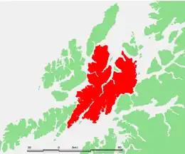 Hinnøya is the fourth-largest island in Norway, and the largest outside the Svalbard archipelago. The 2,204.7-square-kilometre (851.2 sq mi) lies just off the western coast of Northern Norway.[1] The island sits on the border of Nordland and Troms og Finnmark counties. The western part of the island is in the district of Vesterålen, the southwestern part is in the Lofoten district, the southeastern part is in the Ofoten district, and the northeastern part is in Troms.[2] As of 2017, Hinnøya had a population of 32,688.[2] The only town on the island is the town of Harstad. Some of the larger villages include Borkenes, Lødingen, Sigerfjord, and Sørvik. The island is split between the municipalities of Harstad, Tjeldsund and Kvæfjord in Troms og Finnmark county, as well as Andøy, Hadsel, Lødingen, Sortland, and Vågan in Nordland county.[2]