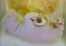 Hippo skin is 6 cm (2 in) thick across much of its body with little hair.[37][40]:260 The animal is mostly purplish-grey or blue-black, but brownish-pink on the underside and around the eyes and ears.[40]:260 Their skin secretes a natural, red-coloured sunscreen substance that is sometimes referred to as "blood sweat" but is neither blood nor sweat. This secretion is initially colourless and turns red-orange within minutes, eventually becoming brown. Two highly acidic pigments have been identified in the secretions; one red (hipposudoric acid) and one orange (norhipposudoric acid), which inhibit the growth of disease-causing bacteria and their light-absorption profile peaks in the ultraviolet range, creating a sunscreen effect.[43][44] Regardless of diet, all hippos secrete these pigments so food does not appear to be their source; rather, they may be synthesised from precursors such as the amino acid tyrosine.[44] This natural sunscreen cannot prevent the animal's skin from cracking if it stays out of water too long.[45]