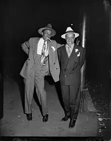 The zoot suit was the popular style amongst hepcats. It incorporated baggy blazer jackets with pants, bright colors, thick chalk stripes, floppy hats, and long chains. Many zoot suiters would often wear a fedora or pork pie hat, color-coordinated with the suit. Occasionally they would have a long feather on the fedora or pork pie hat as decoration.