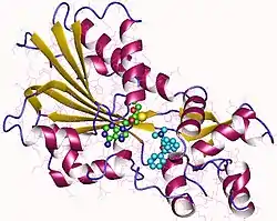 The first domain, called the "MTase domain", contains the active site where methylation occurs. It has a classic fold found in many other methyltransferases, and consists of a seven-stranded beta-sheet surrounded by three helices on each side. This domain binds to its cofactor, S-adenosyl-L-methionine (SAM-e), which provides the methyl group for Nτ-methylation reactions.[12][13]