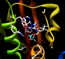The nucleotide/ATP binding pocket is contained within the CA domain and the structural similarity of this pocket is high between most HKs. The cavity of CheA, also crystallized from T. maritima, is first formed by β sheet P4 in the rear and the sides of the cavity are formed by the 4 motifs mentioned earlier, the N, G1, F, and G2 boxes.[9] The majority of the residues coming from the β sheet are hydrophobic with Asp449 being the exception. This residue is invariant and forms a hydrogen bond along with a water molecule to the adenine amine group. Three other water molecules form direct hydrogen bonds with the adenine base. A Mg2+ ion forms a bridge between all three phosphates and an invariant Asn residue. Finally, two more water molecules complete octahedral coordination with Mg2+ and are linked to Arg-408 and His-405. When the γ phosphate of ATP is destabilized, the Mg2+ is no longer observed due to its inability to octahedrally coordinate. Marina et al. argue that similar coordination of Mg2+ occurs in HK853 but that it is unobserved due to the usage of the ATP analog AMPPNP in the crystal structure.[7] During crystallization, the analog was hydrolyzed into a product similar to ADP.