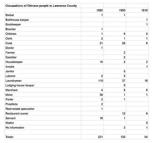 While some had arrived in the Dakota territory for prospects of Gold, others had arrived with the intention of beginning other establishments. A major economic force within the historic Chinatown was the laundry or "washee houses."[18][19] Descriptions of the Chinatown often refer to the numerous laundry establishments that lined the main square.[20] The demand for washing houses was high due to the large amounts of mining that took place in the area. Miners from both Chinatown and Deadwood used these laundry houses to have their garments cleaned.[21] In the year 1880, the occupation of laundryman was the highest listed job of the entire county at 110 individuals, the second highest being mining at 39.[22] The attraction of self-employment, consistency of clientele, and profit all lead the majority of Chinese immigrants within the county to pursue this career.[23] Most Chinese establishments charged 25 cents for a shirt and profits could sometimes come out to as much as 10 dollars daily.[23]