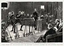 Egerton Castle, Alfred Hutton and Mouatt Biggs giving a demonstration of "Old English sword-and-buckler play" before the Prince of Wales at the Lyceum Theatre in 1891 (The Graphic)
