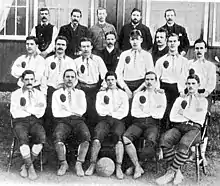 Celtic Football Club was formally constituted at a meeting in St. Mary's church hall in East Rose Street (now Forbes Street), Calton, Glasgow, by Irish Marist Brother Walfrid[1] on 6 November 1887, with the purpose of alleviating poverty in the East End of Glasgow by raising money for the charity Walfrid had instituted, the Poor Children's Dinner Table.[2] Walfrid's move to establish the club as a means of fund-raising was largely inspired by the example of Hibernian who were formed out of the immigrant Irish population a few years earlier in Edinburgh.[3] Walfrid's own suggestion of the name 'Celtic' (still pronounced Seltik, the standard pronunciation in the 19th century), was intended to reflect the club's Irish and Scottish roots, and was adopted at the same meeting.[4][5] The club has the official nickname, "The Bhoys". However, according to the Celtic press office, the newly established club was known to many as "the bold boys". A postcard from the early 20th century that pictured the team, and read "The Bould Bhoys", is the first known example of the unique spelling.[6] The extra 'h' imitates the spelling system of Gaelic, where the letter B is often accompanied by the letter H.