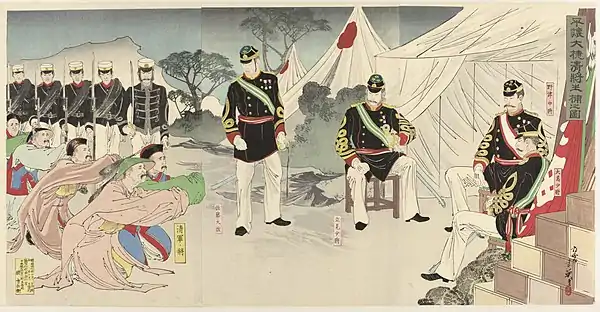 As Hideyoshi's power expanded, he dreamed of conquering China and launched two massive invasions of Korea starting in 1592. Hideyoshi failed to defeat the Chinese and Korean armies on the Korean Peninsula and the war ended after his death in 1598.[116] In the hope of founding a new dynasty, Hideyoshi had asked his most trusted subordinates to pledge loyalty to his infant son Toyotomi Hideyori. Despite this, almost immediately after Hideyoshi's death, war broke out between Hideyori's allies and those loyal to Tokugawa Ieyasu, a daimyō and a former ally of Hideyoshi.[117] Tokugawa Ieyasu won a decisive victory at the Battle of Sekigahara in 1600, ushering in 268 uninterrupted years of rule by the Tokugawa clan.[118]