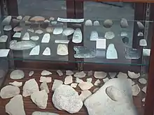 The human presence in the territory that would later become Portugal began in the Lower Paleolithic, as can be proven by the remains of a pre-Acheulean lithic industry.[3] During the Stone Age there was already a rudimentary fishing activity on the Lagos coast, using hooks made from deer antlers, which were found by archaeologist Estácio da Veiga in caves.[9] It is estimated that at that time there were a large number of deer in the region, as more tools made from the antlers have been found, and which were used for harvesting and sowing wheat, barley, vegetables, etc...[9] Until the Roman conquest, boats made of leather were used for fishing, as hides for waterproofing, and with masts made of thin wood, so that they were easy to bend and thus not damaged by the wind.[9] The products of the Lagos fishery, especially tuna and sardines, which were exported salted, became very famous during the ancient civilizations, and were part of the trade between Turdetania and North Africa.[10] The historian Faria e Castro reported that in his time there were still traces of the great fisheries that took place in antiquity, especially of tuna, which was transported in brine to Carthage, where it was highly appreciated.[10] To confirm this theory, Faria e Castro cited several ancient authors, such as Athenaeus, Pliny and Strabo, who claimed that tuna fishing was already quite old on the coast of Lusitania.[10] The historian also mentioned that the transport of salted fish even reached Greece, during the time of Hippocrates.[10] One of the known habits of sailors was to sacrifice a tuna to the god Neptune, when the fishing was very abundant.[10]
