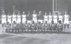 Two years in mid-table followed Macdonald's sale, as Luton finished first 13th,[4] then 12th.[5] In 1972 manager Alec Stock moved on to be replaced by Harry Haslam.[6] Luton managed a second-place finish in 1973–1974 which saw them promoted, but only managed a solitary year in the top flight, as 1974–1975 ended with relegation by a single point.[7][8] December 1975 saw another serious financial crisis at the club, with a special meeting called for the club's shareholders. The refusal of the club's bankers to extend their credit led to Luton's directors paying the wage bill with their own money to prevent the club from being closed down. Liquidation was averted by the sale of Peter Anderson to Royal Antwerp, with the £80,000 raised alleviating the strain on the club's finances.[9][10] Despite these backroom problems, Luton still managed a creditable seventh-place finish in 1975–1976.[11]