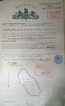 - 1 2 "File:Smooth Island (Tasmania)- Quested mortgage information.JPG". 16 September 2017. Archived from the original on 18 July 2021. Retrieved 18 March 2018 – via Wikipedia.