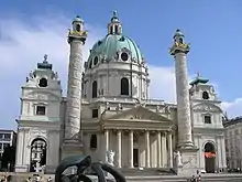Palladio's two domed churches in Venice are Il Redentore (1577–92) and San Giorgio Maggiore (1565–1610), the former built in thanksgiving for the end of a bad outbreak of plague in the city.[48] Inspired by these churches, the two-domed church of Santa Maria della Salute by Baldassare Longhena was built on the edge of Venice's Grand Canal from 1631 to 1681 to celebrate the end of a plague in the city in 1630. The larger dome is 130 feet tall over an octagonal nave for public ceremonies and the smaller dome covers the choir used by the clergy for official celebrations.[50] The architect attributed the shape of the domed church to a crown evoked by the dedication of the church to Mary, Queen of Heaven.[51]