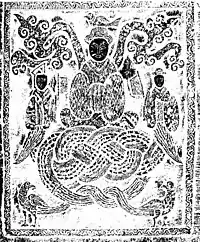 1923 drawing of the eagle-faced Thunder God (雷神; Léishén), punisher of those who go against the order of Heaven. In the oldest accounts, he and the Yellow Emperor are one and the same.[44][45] In other accounts, such as the Huangdi Neijing, Leishen is the Yellow Emperor's foremost pupil.