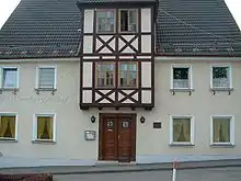 The settlement of the Jews in Laupheim developed on the so-called Judenberg ("Jews’ mountain" or rather "Jews’ hill") with the Judengasse ("Jews’ Lane") at its centre, a ghetto-like area, separated from the rest of the town, yet in close proximity to the market square. The Judenberg forms a regular square where the 8 oldest houses, arranged in 3 rows, are positioned parallel to one of the main streets leading away from the town centre.[10] The local Jews were allowed to influence the planning and design of their houses from the end of the 18th century onwards. It is remarkable, even today, that all houses are approachable from the front as well as the back, and that even the front yards and front gardens are not fenced in. The reason for this lies in the fact that the Judengasse was meant to incorporate the whole Jewish settlement to form an eruv.[19]