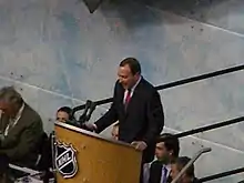 By 2004, the owners were claiming that player salaries had grown far faster than revenues, and that the league as a whole lost over US$300 million in 2002–03.[136] As a result, on September 15, 2004, Gary Bettman announced that the owners again locked the players out before the start of the 2004–05 season.[137] On February 16, 2005, Bettman announced the cancellation of the entire season.[138] As with the 1994–95 lockout, the owners were again demanding a salary cap, which the players were unwilling to consider until the season was on the verge of being lost.[137] The season's cancellation led to a revolt within the union. NHLPA president Trevor Linden and senior director Ted Saskin took charge of negotiations from executive director Bob Goodenow.[139] By early July, the two sides had agreed to a new collective bargaining agreement.[137] The deal featured a hard salary cap, linked to a fixed percentage of league revenues and a 24% rollback on salaries.[140]
