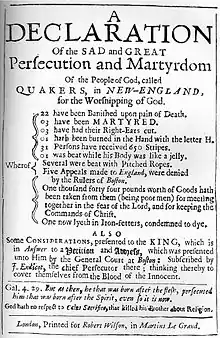 In 1657 some Quakers were able to find refuge to practice in Providence Plantations established by Roger Williams.[25] Other Quakers faced persecution in Puritan Massachusetts. In 1656 Mary Fisher and Ann Austin began preaching in Boston. They were considered heretics because of their insistence on individual obedience to the Inner Light. They were imprisoned and banished by the Massachusetts Bay Colony. Their books were burned, and most of their property was confiscated. They were imprisoned under terrible conditions, then deported.[26]