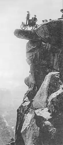 In 1900, Oliver Lippincott became the first to drive an automobile into Yosemite Valley.[46] Yosemite Valley Railroad, nicknamed "the short line to paradise," arrived at nearby El Portal, California in 1907.[47] Numerous hiking and horse trails were cleared, including a walking path through Mariposa Grove.