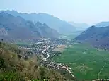 Mai Châu is the central town of Mai Châu district. It is famous for its traditional ethnic minority groups, rice terraces and green mountainous landscapes.[7] Tourists can travel by motorbike if they want to enjoy landscapes along the way, using bus or private car. It is 140-150km from Hanoi capital to this place[8]