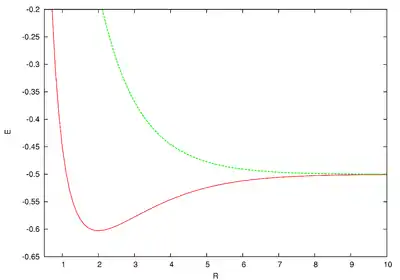 Energies (E) of the two lowest discrete states of the hydrogen molecular ion , as a function of inter-nuclear distance (R) in atomic units.