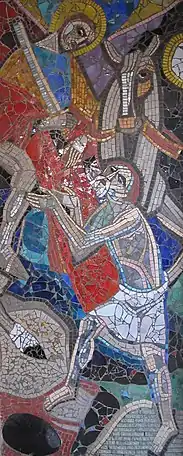 The majority of the church's furnishings date from the time the church was built. The altar panels of all of the four altars were created by the electoral court painter Johann Caspar Sing from Munich. The main altar painting depicts the Holy Kinship, Jesus Christ surrounded by his relatives. Up to the beginning of the 19th century, the interior of the church was also decorated by ceiling paintings by the famous artist, Cosmas Damian Asam. Today's ceiling frescoes are Michael P. Weingartner's work from 1952. They show various scenes of the life of Francis of Assisi. The church's Stations of the Cross date from 1862. The war memorial is situated under the archways that surround the church. The accompanying mosaics, like the ceiling paintings, are also by Michael P. Weingartner.[1]