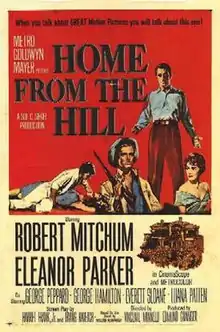Home from the Hill is a 1960 American Metrocolor drama film starring Robert Mitchum, Eleanor Parker, George Peppard, George Hamilton, Everett Sloane and Luana Patten. Directed in CinemaScope by Vincente Minnelli, it was produced by Edward Grainger, and distributed by MGM. The screenplay was adapted from the 1958 novel of the same name by William Humphrey. The film was entered into the 1960 Cannes Film Festival.[3] The title is from the last line of Robert Louis Stevenson's short poem "Requiem".