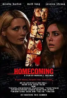 Homecoming is a 2009 American independent horror-thriller film,[1] directed by Morgan J. Freeman and written by Katie L. Fetting, Jake Goldberger and Frank Hannah.[2] The film follows a student couple, Mike (Matt Long) and Elizabeth (Jessica Stroup), on their homecoming. Elizabeth is taken home by Mike's ex-girlfriend Shelby (Mischa Barton) after a road accident. Shelby is soon revealed to be fixated on Mike and subsequently treats Elizabeth in a cruel and deranged manner. The film was poorly received by critics but was a box office success, grossing $8.5 million against a $1.5 million budget.
