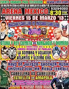 On February 21, 2013, CMLL held a press conference to officially announce that the Homena a Dos Leyendas would pay tribute to Rayo de Jalisco ("The Lighting from Jalisco") and brought out Rayo's son, Rayo de Jalisco Jr., as part of the announcement. Rayo de Jalisco Jr. had not worked for CMLL since 2010 but made a special appearance due to the company honoring his father. During the press conference Rayo de Jalisco Jr.'s long time rival Universo 2000 interrupted Rayo de Jalisco Jr. and the two ended up challenging each other to a match that would take place at the 2013 Homenaje a Dos Leyendas, although the exact nature of the match was not announced at the time. The rivalry between the two wrestlers hailed back to at least 1997 where Universo 2000 defeated both Cien Caras and Rayo de Jalisco Jr. to win the CMLL World Heavyweight Championship.[28][29] Universo 2000 defended the title three times during his reign: against Brazo de Plata, Máscara Sagrada, and Rayo de Jalisco Jr., before losing the championship to Rayo de Jalisco Jr. on September 13, 1998.[28] Universo 2000 regained the title on December 10, 1999[29] Universo 2000's second reign became a recordbreaking reign in several areas, it was the longest to date as it lasted 1,225 days. He also became the champion with most successful title defenses in one reign including eight defenses against Rayo de Jalisco Jr. during their long running rivalry.[29] After being masked since his debut in 1985 Universo 2000 lost a Lucha de Apuesta match to El Canek in the main event of the 71st Anniversary Show, on September 17, 2004, the match also included Rayo de Jalisco Jr. and Dr. Wagner Jr. and originally came about due to the Universo 2000/Rayo de Jalisco Jr. rivalry.[30] Following his unmasking Universo 2000 won the 2004 Leyenda de Azul (Blue legend tournament).[31] In subsequent years both Universo 2000 and Rayo de Jalisco Jr. left CMLL. In 2005 Rayo de Jalisco Jr. suffered another serious injury, he injured both his knees in a match against Universo 2000's brother Máscara Año 2000, where his legs got caught on the ropes as he jumped out of the ring and he tore ligaments in both knees. The injury kept him out of the ring for almost half a year but in the end Rayo de Jalisco Jr. was able to make a full recovery and return to the ring.[32] The incident was used by several promoters as well as Rayo de Jalisco Jr. himself to create more interest in matches between himself and Universo 2000, Cien Caras and Máscara Año 2000. Rayo de Jalisco Jr. made his return to CMLL in May, 2010, siding with the CMLL loyalists in their feud with Los Invasores, especially Invasore members Universo 2000 and Máscara Año 2000, reigniting the long running storyline between them.[33] But Rayo, Universo and Cien Caras only worked a select few dates for CMLL before leaving again. The official match between the long time rivals saw each team up with participants of the 2013 Torneo Parejas Increibles, only in this case they were on opposite sides instead of teaming up. Rayo de Jalisco Jr. would team up with Shocker and Rush while Universo 2000 would team up with Shocker's rival Mr. Niebla and Rush's rival El Terrible. Shocker and Mr. Niebla had a long backstory between then, having actually worked together as a regular tag team in the late 1990s. In 1998 the two defeated Dr. Wagner Jr. and Emilio Charles Jr. to win the CMLL World Tag Team Championship and would subsequently defend the tag team championship against teams such as Blue Panther and Black Warrior, Bestia Salvaje and Scorpio Jr. and the Hermanas Dinamita (Cien Caras and Universo 2000). In October, 1998 Mr. Niebla suffered an injury during a match, an injury that was so severe that Mr. Niebla was forced to vacate the Tag Team title.[34] Upon his return Mr. Niebla continued to team with Shocker but the team were not able to win the Tag Team title back. On September 24, 1999, at the CMLL 66th Anniversary Show, the team of Nr. Niebla and Shocker faced Atlantis and Villano III in a Relevos suicida match, a match where the losing team would fight each other for their mask. In the main event match of CMLL's 66th Anniversary show, Atlantis and Villano III defeated the much less experienced team, afterwards Mr. Niebla defeated Shocker to unmask him.[35] In the years since Shocker's unmasking the two have wrestled each other on numerous occasions, both in CMLL and other promotions. The two teamed up for the Parejas Increibles tournament and made it to the semi-final but lost to La Sombra and Volador Jr. when the tension between the two became a distraction in the match.[24][25] The rivalry between Rush and El Terrible started when El Terrible defeated Rush in the finals of a tournament to determine a holder of the CMLL World Heavyweight Championship on January 1, 2012.[36] The two were also paired up for the 2012 Torneo Nacional de Parejas Increibles, and in the weeks leading up to the tournament Rush stated that he was willing to set aside his differences with El Terrible as he wanted to win the Parejas Increibles tournament, despite the two having developed a heated rivalry over the last number of months.[37] After getting along and qualifying for the final match Rush and El Terrible's miscommunication and dissension allowed their opponents to win the match and the tournament. Following the match Rush took a microphone and berated both El Terrible and the fans for their actions that night and then followed it up by challenging El Terrible to a Luchas de Apuestas, hair vs. hair match at a later date. El Terrible did not accept the challenge at that point in time.[38] The two faced off in the main event of the CMLL 79th Anniversary Show in a Lucha de Apuestas, hair vs. hair match that was won by Rush.[10] The storyline continued to develop in the months following the anniversary event and included El Terrible successfully defending the CMLL World Heavyweight Championship against Rush on January 22, 2013.[39][40] T