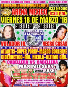 On September 11, 2015, Ramón Ibarra Banda, better known as Super Parka returned to CMLL after an almost eight-year absence to team with his son Volador Jr.[5] A couple of months later Super Parka began working a storyline feud against Negro Casas, one of CMLL's resident veteran rudos. The story line eventually led to the two captaining a team of three, facing off during the 2015 Infierno en el Ring. Super Parka teamed with Máximo Sexy and Valiente while Casas teamed up with Kamaitachi and Bárbaro Cavernario. After Super Parka's team won the match both Super Parka and Casas laid out a Lucha de Apuestas challenge, daring each other to put their hair on the line for a special "bet match" between the two. Moments later CMLL officials came to the ring to sign the contract for the following week's Sin Piedad ("No Mercy") show.[6][7] Casas defeated Super Parka, forcing Super Parka to have all his hair shaved off as a result.[8][9] Casas' nephew Puma helped his uncle win the match, much to the displeasure of Volador Jr. who was in his father's corner. Volador Jr. vowed to get revenge for what he described as the Casas family's cheating ways. The first time Volador Jr. faced off against Negro Casas after Sin Pieda Puma and his brother Tiger interfered in the match, helping their uncle win the match. The story line between Volador Jr. and Negro Casas led to Volador Jr. defending the NWA World Historic Welterweight Championship against Negro Casas on February 15, 2016. On February 24 CMLL held a press conference where Volador Jr. and Negro Casas both agreed to put their hair on the line in a Lucha de Apuestas match, officially announcing the main event of the 2016 Homenaje a Dos Leyendas show.[10]