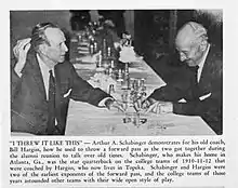 In the team's 1910 game at Washburn, Arthur Schabinger has been credited by some to have thrown the first legal forward pass in college football history.[7] While this claim is widely disputed by other colleges (there are multiple claims dating back to 1906), College of Emporia most certainly was one of the first innovators of the play particularly to throw "overhand" forward passes instead of the more common "underhand" passes.[8] The school was using the forward pass as a regular play three years before Knute Rockne and Notre Dame.[9]