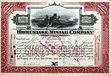 Homestake Mining Company was one of the largest gold mining businesses in the United States and the owner of the Homestake Mine in Lead, South Dakota. Founded in 1877, it was acquired by Barrick Gold in December 2001.